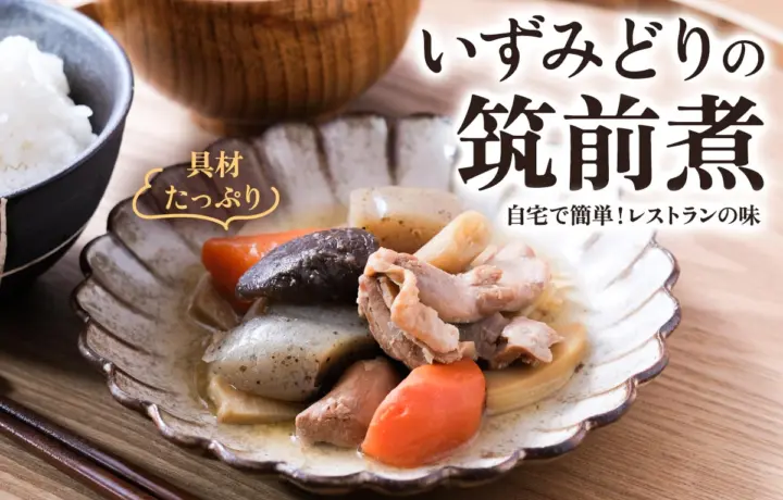 温厚な気候と豊かな自然が育んだ「いずみどり」と鹿児島で採れたにんじん・たけのこ・ごぼう・椎茸を筑前煮にしました。鹿児島県出水市にある「レストラン 三蔵」で作られた筑前煮は、店主西尾さんのこだわりと、鹿児島の食材が織りなす旨味をたっぷり感じられる一品です。