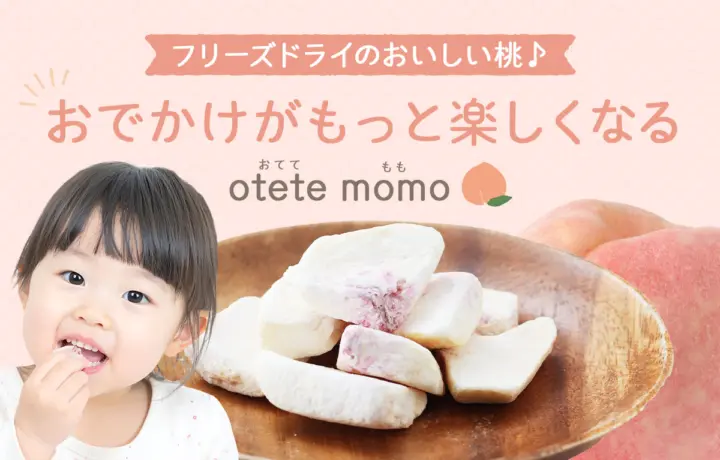国産桃のおいしさ&栄養をギュッと閉じ込めた「otete momo」は、忙しいママの声から生まれた新感覚ドライフルーツです。独自のフリーズドライ製法で水分だけをやさしく抜き、サクッ、ふわっ、新食感を実現。噛めば噛むほどに果汁感が広がり、生の桃のような香りと自然な甘さを楽しめます。持ち運びにも便利な個包装なので、幼稚園の送り迎えや公園遊び、車での移動中にも大活躍。更にフリーズドライなので果汁で手がべたべたにもならず衛生的です。